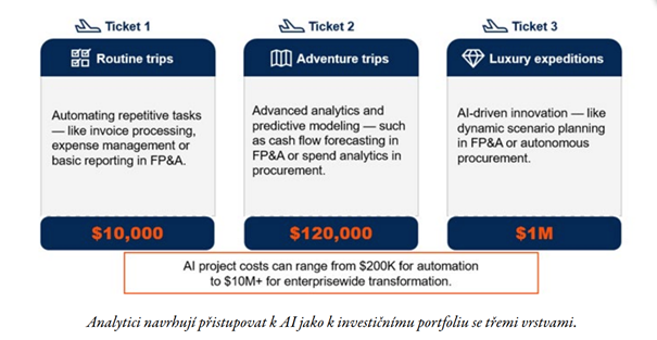 Analytici navrhují přistupovat k AI jako k investičnímu portfoliu se třemi vrstvami. První jsou rutinní použití automatizující opakující se úkony – levná, rychlá, snadno měřitelná. Druhá